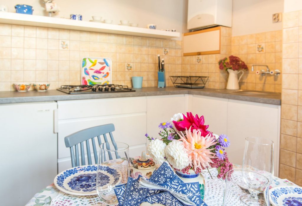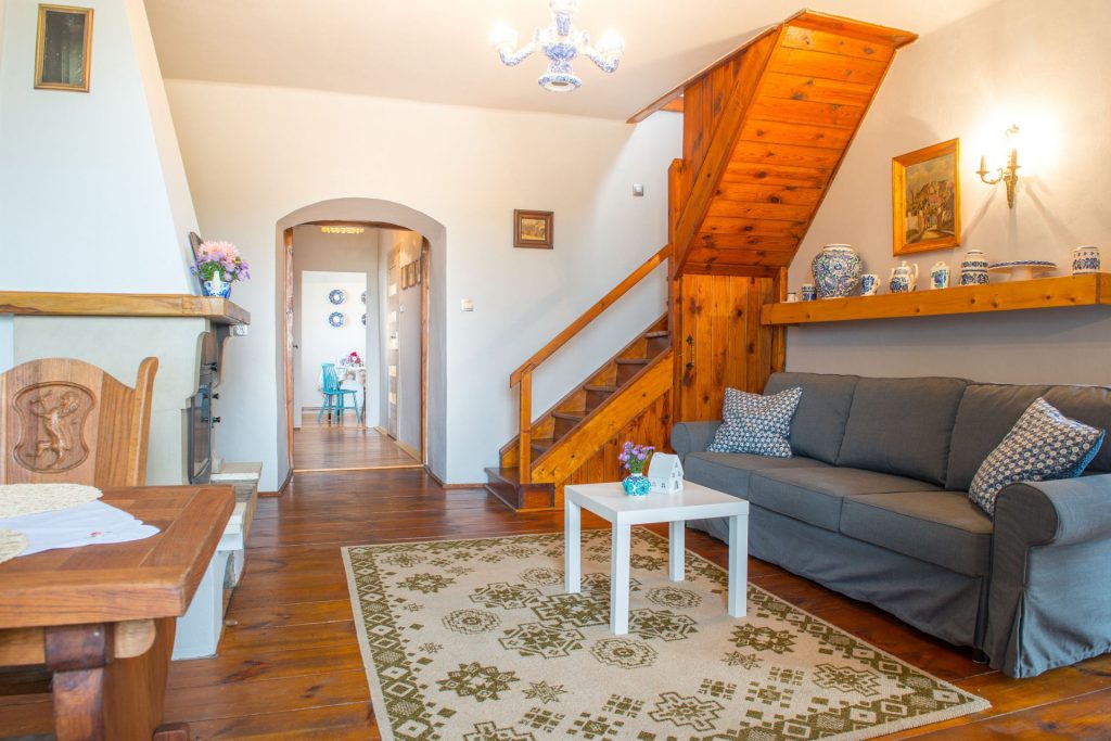 Na dolnym poziomie znajduje się salon z rozkładaną kanapą, kuchnia z płytą gazową, łazienka z prysznicem. Natomiast na poddaszu mieści się przestronna sypialnia z łóżkiem małżeńskim.